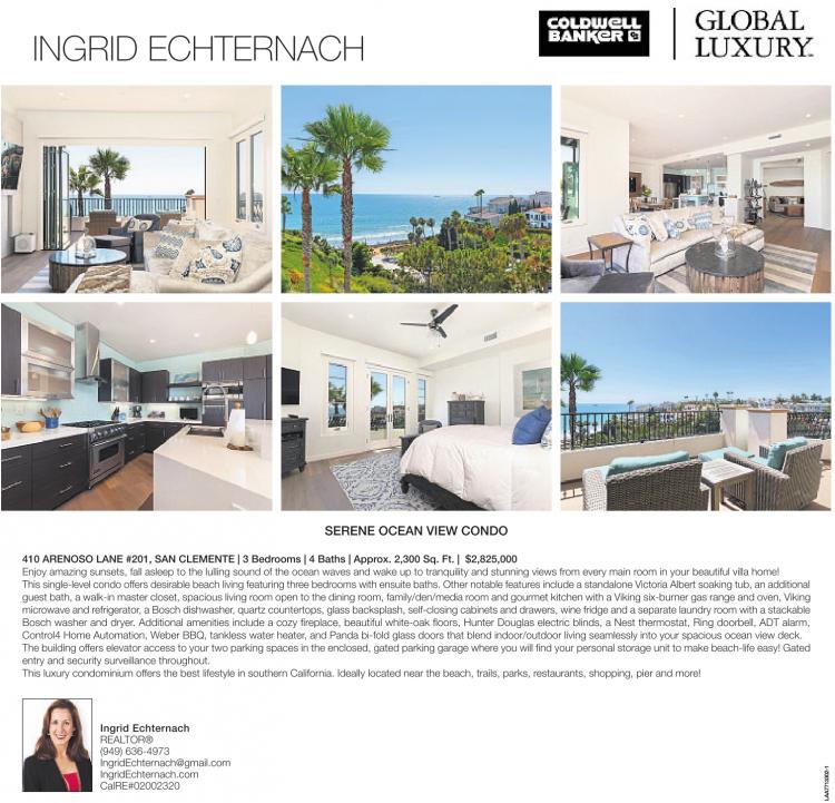 INGRID ECHTERNACH SERENE OCEAN VIEW CONDO 410 ARENOSO LANE #201, SAN CLEMENTE | 3 Bedrooms | 4 Baths | Approx. 2,300 Sq. Ft. | $2,825,000 Enjoy amazing sunsets, fall asleep to the lulling sound of the ocean waves and wake up to tranquility and stunning views from every main room in your beautiful villa home! This single-level condo offers desirable beach living featuring three bedrooms with ensuite baths. Other notable features include a standalone Victoria Albert soaking tub, an additional guest bath, a walk-in master closet, spacious living room open to the dining room, family/den/media room and gourmet kitchen with a Viking six-burner gas range and oven, Viking microwave and refrigerator, a Bosch dishwasher, quartz countertops, glass backsplash, self-closing cabinets and drawers, wine fridge and a separate laundry room with a stackable Bosch washer and dryer. Additional amenities include a cozy fireplace, beautiful white-oak floors, Hunter Douglas electric blinds, a Nest thermostat, Ring doorbell, ADT alarm, Control4 Home Automation, Weber BBQ, tankless water heater, and Panda bi-fold glass doors that blend indoor/outdoor living seamlessly into your spacious ocean view deck. The building offers elevator access to your two parking spaces in the enclosed, gated parking garage where you will find your personal storage unit to make beach-life easy! Gated entry and security surveillance throughout. This luxury condominium offers the best lifestyle in southern California. Ideally located near the beach, trails, parks, restaurants, shopping, pier and more! Ingrid Echternach REALTOR® (949) 636-4973 IngridEchternach@gmail.com IngridEchternach.com CalRE#02002320