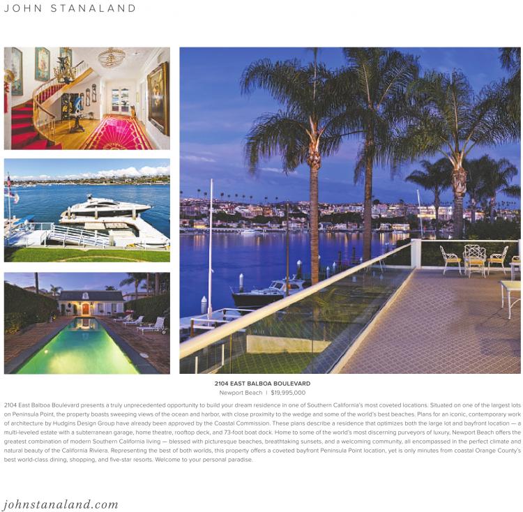 2104 East Balboa Boulevard presents a truly unprecedented opportunity to build your dream residence in one of Southern California’s most coveted locations. Situated on one of the largest lots on Peninsula Point, the property boasts sweeping views of the ocean and harbor,with close proximity to the wedge and some of the world’sbest beaches. Plans for an iconic, contemporary work of architecture by Hudgins Design Group have already been approved by the Coastal Commission. These plans describe a residence that optimizes both the large lot and bayfront location — a multi-leveled estate with a subterranean garage, home theatre, rooftop deck, and 73-foot boat dock. Home to some of the world’s most discerning purveyors of luxury, Newport Beach offers the greatest combination of modern Southern California living — blessed with picturesque beaches, breathtaking sunsets, and a welcoming community, all encompassed in the perfect climate and natural beauty of the California Riviera. Representing the best of both worlds, this property offers a coveted bayfront Peninsula Point location, yet is only minutes from coastal Orange County’s best world-class dining, shopping, and five-star resorts. Welcome to your personal paradise.