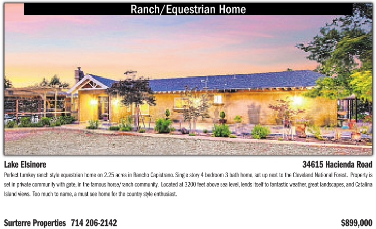 Perfect turnkey ranch styleequestrian home on 2.25 acres in RanchoCapistrano. Single story 4bedroom3bath home, set up nexttothe Cleveland NationalForest. Property is set in privatecommunity with gate, in thefamoushorse/ranchcommunity. Locatedat3200feet above sealevel, lends itself to fantastic weather, great landscapes, and Catalina Island views. Too much to name, amust seehome forthe country style enthusiast.