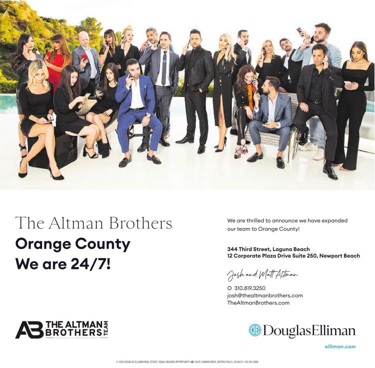 The Altman Brothers Orange County We are 24/7! We are thrilled to announce we have expanded our team to Orange County! 344 Third Street, Laguna Beach 12 Corporate Plaza Drive Suite 250, Newport Beach O 310.819.3250 josh@thealtmanbrothers.com TheAltmanBrothers.com elliman.com ©2020 DOUGLAS ELLIMAN REAL ESTATE. EQUALHOUSINGOPPORTUNITY. 150ELCAMINODRIVE,BEVERLY HILLS, CA 90212. 310.595.3888