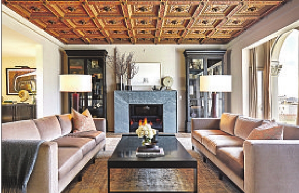 Original heirloom coffered ceilings top the living room, and the adjacent great room combines adining room with custom drapes, afamily room with back-lit bookcases and a kitchen with marble counters.