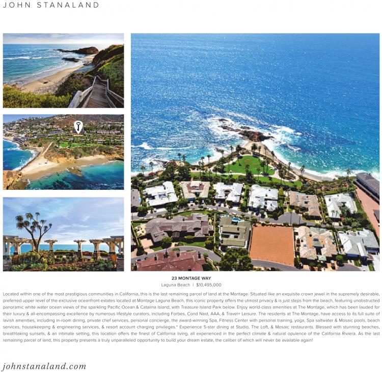 J O H N S T A N A L A N D 23 MONTAGE WAY Laguna Beach | $10,495,000 Located within one of the most prestigious communities in California, this is the last remaining parcel of land at the Montage. Situated like an exquisite crown jewel in the supremely desirable, preferred upper level of the exclusive oceanfront estates located at Montage Laguna Beach, this iconic property offers the utmost privacy & is just steps from the beach, featuring unobstructed panoramic white water ocean views of the sparkling Pacific Ocean & Catalina Island, with Treasure Island Park below. Enjoy world-class amenities at The Montage, which has been lauded for their luxury & all-encompassing excellence by numerous lifestyle curators, including Forbes, Cond Nast, AAA, & Travel+ Leisure. The residents at The Montage, have access to its full suite of lavish amenities, including in-room dining, private chef services, personal concierge, the award-winning Spa, Fitness Center with personal training, yoga, Spa saltwater & Mosaic pools, beach services, housekeeping & engineering services, & resort account charging privileges.* Experience 5-star dining at Studio, The Loft, & Mosaic restaurants. Blessed with stunning beaches, breathtaking sunsets, & an intimate setting, this location offers the finest of California living, all experienced in the perfect climate & natural opulence of the California Riviera. As the last remaining parcel of land, this property presents a truly unparalleled opportunity to build your dream estate, the caliber of which will never be available again! johnstanaland .com