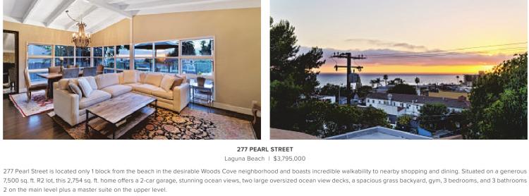 277 PEARL STREET Laguna Beach | $3,795,000 277 Pearl Street is located only 1 block from the beach in the desirable Woods Cove neighborhood and boasts incredible walkability to nearby shopping and dining. Situated on a generous 7,500 sq. ft. R2 lot, this 2,754 sq. ft. home offers a 2-car garage, stunning ocean views, two large oversized ocean view decks, a spacious grass backyard, gym, 3 bedrooms, and 3 bathrooms 2 on the main level plus a master suite on the upper level.