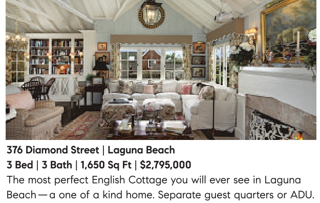376 Diamond Street | Laguna Beach 3 Bed | 3 Bath | 1,650 Sq Ft | $2,795,000 The most perfect English Cottage you will ever see in Laguna Beach —a one of a kind home. Separate guest quarters or ADU.