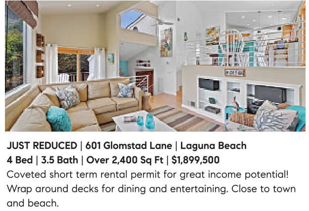 JUST REDUCED | 601 Glomstad Lane | Laguna Beach 4 Bed | 3.5 Bath | Over 2,400 Sq Ft | $1,899,500 Coveted short term rental permit for great income potential! Wrap around decks for dining and entertaining. Close to town and beach.