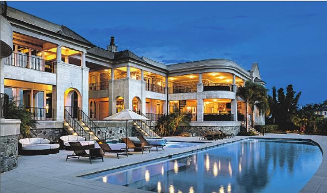 Hand-carved granite and limestone give the seven-bedroom, 16-bathroom residence a palatial appearance.