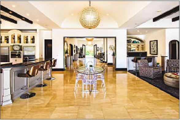 Acovered patio lines the back of the home, extending to a pavilion with a lounge, dining area, lawn and 25,000-gallon infinityedge pool. The property sits on just over half an acre.