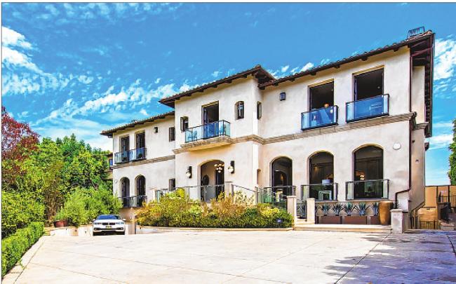 Two master suites are among the three bedrooms and five bathrooms. The lower level holds a wet bar, sound room, recording studio and barbershop. An elevator navigates the three-story floor plan.