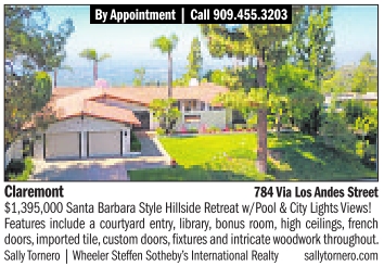 By Appointment |Call 909.455.3203 Claremont 784Via Los Andes Street $1,395,000 Santa Barbara Style Hillside Retreat w/Pool &City Lights Views! Features include acourtyard entry,library,bonus room,high ceilings,french doors,importedtile,custom doors,fixtures and intricate woodwork throughout. Sally Tornero |WheelerSteffen Sotheby’sInternationalRealty sallytornero.com