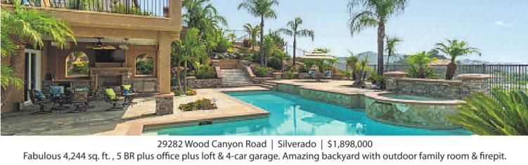 29282 Wood Canyon Road | Silverado | $1,898,000 Fabulous 4,244 sq.ft. ,5 BR plus office plus loft & 4-car garage. Amazing backyard with outdoor family room & firepit.