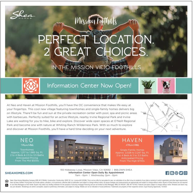 PERFECT LOCATION. 2 GREAT CHOICES. IN THE MISSION VIEJO FOOTHILLS Information Center Now Open!155 Hideaway Loop, Mission Viejo, CA 92692 | 866.OWN.SHEA Information Center Open Daily By Appointment 11am - 6pm l Wednesday 2pm - 6pm Sales: Shea Homes Marketing Company (DRE #01378646), Construction: Construction: SHSC GC, Inc, License (#0102096). This is not an offer for real estate for sale, nor solicitation of an offer to buy to residents of any state or province in which registration and other legal requirements have not been fulfilled. Pricing does not include options, elevation, or lot premiums, effective date of publication and subject to change without notice. All square footages and measurements are approximate and subject to change without notice. Buyers of Shea Homes are not required to use Shea Mortgage as their lender.Buyers may select any lending institution for the purpose of securing mortgage financing and are not limited to Shea Mortgage. NMLS ID #40397, DRE #01197403. Features and plans subject to change without notice. Windows and doors may varyper elevation. Renderings are artist’sconception, based on preliminaryinformation, and subject to change. Models are notanindication of racial preference. Trademarks are property of their respectiveowners. Equal Housing Opportunity. 10/2020