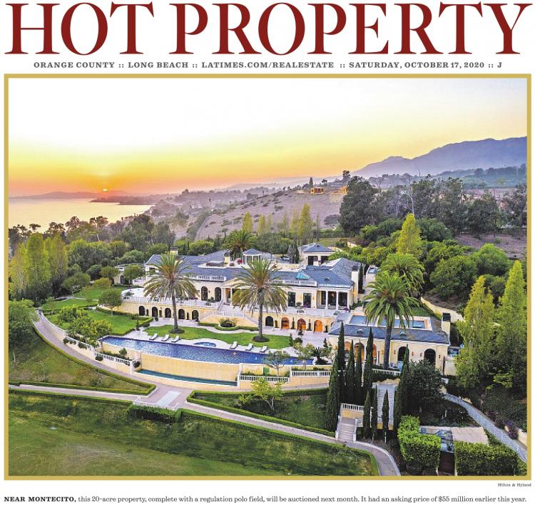 HOT PROPERTY ORANGE COUNTY :: LONG BEACH :: LATIMES.COM/REALESTATE :: SATURDAY, OCTOBER 17, 2020 :: J Hilton & Hyland NEAR MONTECITO, this 20-acre property, complete with a regulation polo field, will be auctioned next month. It had an asking price of $55 million earlier this year.