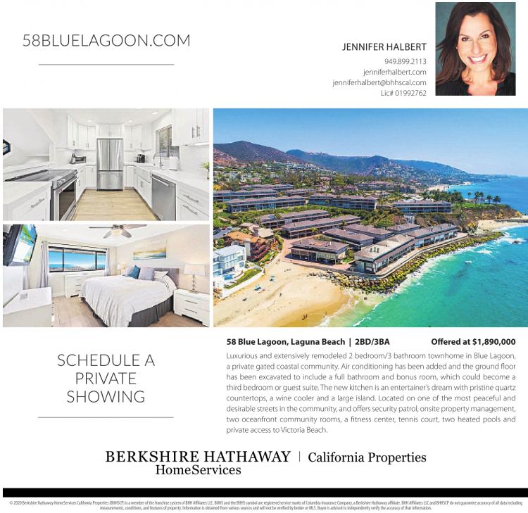 58BLUELAGOON.COM JENNIFER HALBERT 949.899.2113 jenniferhalbert.com jenniferhalbert@bhhscal.com Lic# 01992762 SCHEDULE A PRIVATE SHOWING 58 Blue Lagoon, Laguna Beach | 2BD/3BA Offered at $1,890,000 Luxurious and extensively remodeled 2 bedroom/3 bathroom townhome in Blue Lagoon, a private gated coastal community. Air conditioning has been added and the ground floor has been excavated to include a full bathroom and bonus room, which could become a third bedroom or guest suite. The new kitchen is an entertainer’s dream with pristine quartz countertops, a wine cooler and a large island. Located on one of the most peaceful and desirable streets in the community, and offers security patrol, onsite property management, two oceanfront community rooms, a fitness center, tennis court, two heated pools and private access to Victoria Beach. ©2020BerkshireHathaway HomeServices California Properties (BHHSCP)isamember of the franchise system of BHH AffiliatesLLC.BHHS and the BHHS symbol areregistered servicemarks of Columbia InsuranceCompany, aBerkshireHathaway affiliate.BHH AffiliatesLLC and BHHSCP do not guaranteeaccuracyofall data including measurements,conditions,and features of property.Information is obtained from varioussources andwill not be verified by broker or MLS. Buyer is advised to independently verify the accuracyofthatinformation.