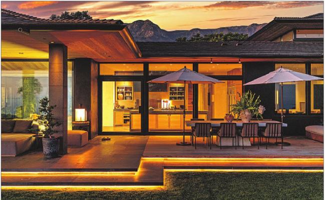 Designed for entertaining, the secluded property is tucked behind two sets of gates and centers on a three-story home of nearly 6,300 square feet. Out back, palm trees and string lights top a resortstyle space with a swimming pool, spa, gazebo, shower room and cabana with a bar.