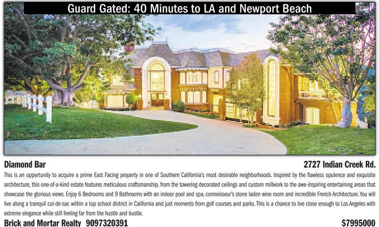 Diamond Bar Guard Gated: 40 Minutes to LA and Newport Beach 2727 Indian Creek Rd. This is an opportunitytoacquireaprime East Facing property in oneofSouthern California’s most desirableneighborhoods. Inspired by the flawlessopulence and exquisite architecture, thisone-of-a-kind estatefeaturesmeticulous craftsmanship, from thetowering decorated ceilings andcustom millwork to the awe-inspiring entertaining areas that showcase the glorious views. Enjoy 6Bedroomsand 9Bathroomswith an indoor pool and spa,connoisseur’s stone laden wine room and incredibleFrenchArchitecture.Youwill livealong atranquil cul-de-sacwithin atop school district in Californiaand justmoments from golf courses andparks.This is achance to liveclose enough to Los Angeles with extremeelegance while still feeling farfromthe hustle andbustle. Brick and Mortar Realty 9097320391 $7995000