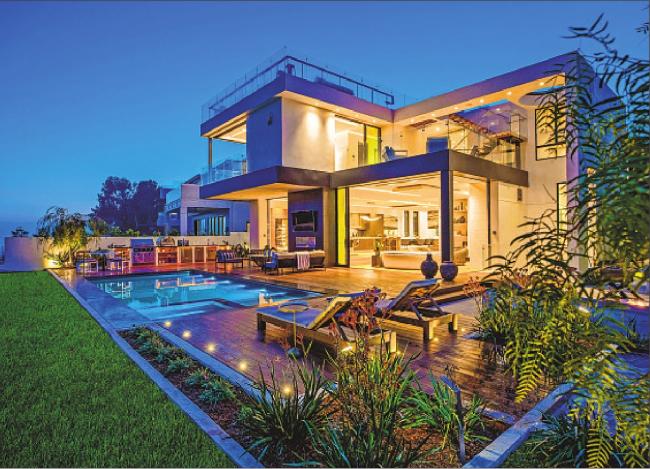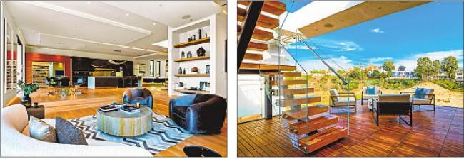 Features: Ten-foot smart door; sky-lit atrium; dining area with floating fireplace; sunken lounge; private office; floating staircase; scenic owner’s suite with private deck; huge walk-in closet; Ipe wood rooftop deck; swimming pool and spa; waterfall; outdoor lounge with TV