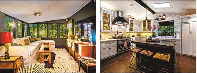 Inside, spaces include a living room with beamed ceilings and whitewashed brick and a windowlined media room. Another highlight is the kitchen, complete with skylight, imported cabinetry and heated floors.