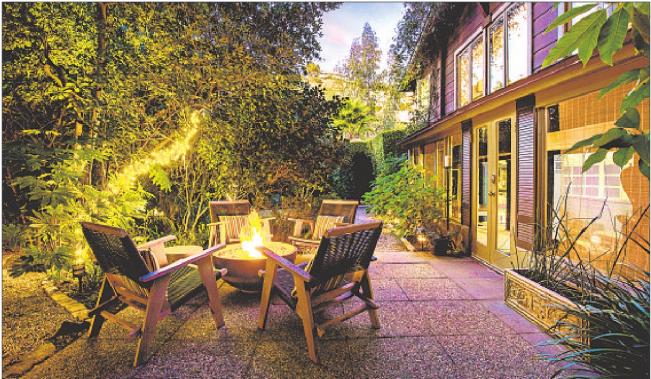 Updated over the years but still in touch with its vintage charm, the two-story home is perched in the Hollywood Dell and shrouded in landscaping. Privacy hedges guard the front, and out back, there’s a tropical backyard with a fountain and flagstone patio.