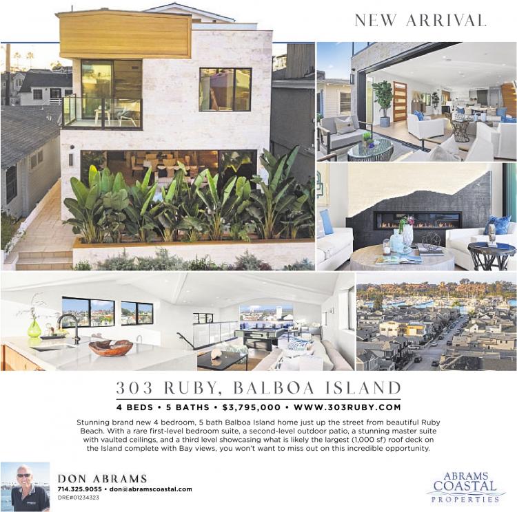 NEW ARRIVAL 303 RUBY, BALBOA ISLAND 4 BEDS • 5 BATHS • $3,795,000 • WWW.303RUBY.COM Stunning brand new 4 bedroom, 5 bath Balboa Island home just up the street from beautiful Ruby Beach. With a rare first-level bedroom suite, a second-level outdoor patio, a stunning master suite with vaulted ceilings, and a third level showcasing what is likely the largest (1,000 sf) roof deck on the Island complete with Bay views, you won’t want to miss out on this incredible opportunity. 714.325.9055 • don@abramscoastal.com DRE#01234323