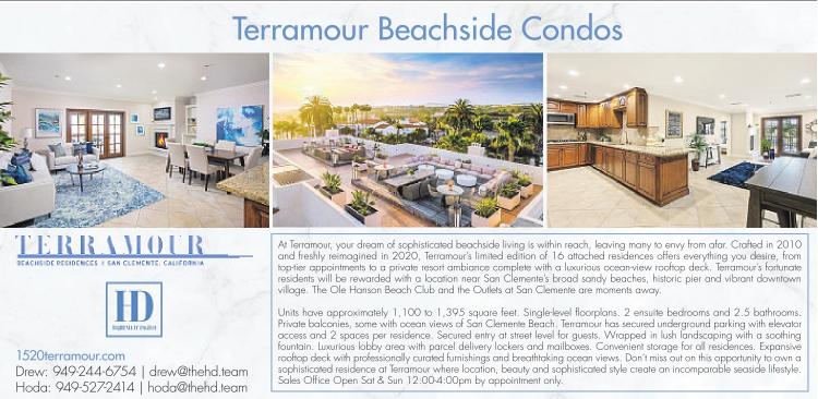 Terramour Beachside Condos At Terramour, your dream of sophisticated beachside living is within reach, leaving many to envy from afar. Crafted in 2010 and freshly reimagined in 2020, Terramour’s limited edition of 16 attached residences offers everything you desire, from top-tier appointments to a private resort ambiance complete with a luxurious ocean-view rooftop deck. Terramour’s fortunate residents will be rewarded with a location near San Clemente’s broad sandy beaches, historic pier and vibrant downtown village. The Ole Hanson Beach Club and the Outlets at San Clemente are moments away. 1520terramour.com Drew: 949-244-6754 | drew@thehd.team Hoda: 949-527-2414 | hoda@thehd.team Units have approximately 1,100 to 1,395 square feet. Single-level floorplans. 2 ensuite bedrooms and 2.5 bathrooms. Private balconies, some with ocean views of San Clemente Beach. Terramour has secured underground parking with elevator access and 2 spaces per residence. Secured entry at street level for guests. Wrapped in lush landscaping with a soothing fountain. Luxurious lobby area with parcel delivery lockers and mailboxes. Convenient storage for all residences. Expansive rooftop deck with professionally curated furnishings and breathtaking ocean views. Don’t miss out on this opportunity to own a sophisticated residence at Terramour where location, beauty and sophisticated style create an incomparable seaside lifestyle. Sales Office Open Sat & Sun 12:00-4:00pm by appointment only.
