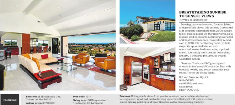 The Details Location: 28 Skysail Drive City, Corona del Mar 92625 Asking price: $2,749,000 Year built: 1977 Living area: 2,678 square feet, 3 bedrooms, 2.5 bathrooms BREATHTAKING SUNRISE TO SUNSET VIEWS Wyrick & Associates Boasting panoramic ocean, Catalina Island and greenbelt views, this enticing Corona del Mar property offers more than 2,600 square feet of coastal living. On the upper level, a solid glass wall opens onto a stunning oversized and heated custom deck. Exquisitely remodeled in 2010, this captivating home, with its elegantly appointed kitchen and oversized master bedroom suite, is priced to sell. You simply can’t beat its best-selling feature… a perfectly picturesque coastal California setting. “Jasmine Creek is a 24/7 guard-gated enclave in the heart of Corona del Mar with beaches nearby and resort amenities yearround,” notes the listing agent. Bill and Suzanne Wyrick 949.466.3161 suz9921@gmail.com asteam.com DRE#: 00604730 Features: Unforgettable views from sunrise to sunset; oversized elevated corner lot; engineered wood and marble flooring; upper-level living all with a view; custom sound, lighting, painting, and water filtration; wall of disappearing windows See also