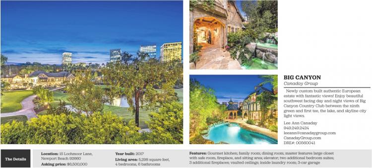 The Details Location: 15 Lochmoor Lane, Newport Beach 92660 Asking price: $6,500,000 Year built: 2017 Living area: 5,298 square feet, 4 bedrooms, 6 bathrooms BIG CANYON Canaday Group Newly custom built authentic European estate with fantastic views! Enjoy beautiful southwest facing day and night views of Big Canyon Country Club between the ninth green and first tee, the lake, and skyline city light views. Lee Ann Canaday 949.249.2424 leeann@canadaygroup.com CanadayGroup.com DRE#: 00560041 Features: Gourmet kitchen; family room; dining room; master features large closet with safe room, fireplace, and sitting area; elevator; two additional bedroom suites; 3 additional fireplaces; vaulted ceilings; inside laundry room; 3-car garage See also