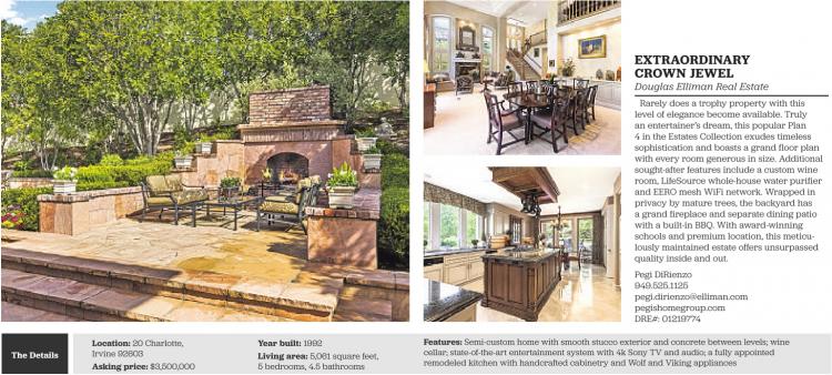 The Details Location: 20 Charlotte, Irvine 92603 Asking price: $3,500,000 Year built: 1992 Living area: 5,061 square feet, 5 bedrooms, 4.5 bathrooms EXTRAORDINARY CROWN JEWEL Douglas Elliman Real Estate Rarely does a trophy property with this level of elegance become available. Truly an entertainer’s dream, this popular Plan 4 in the Estates Collection exudes timeless sophistication and boasts a grand floor plan with every room generous in size. Additional sought-after features include a custom wine room, LifeSource whole-house water purifier and EERO mesh WiFi network. Wrapped in privacy by mature trees, the backyard has a grand fireplace and separate dining patio with a built-in BBQ. With award-winning schools and premium location, this meticulously maintained estate offers unsurpassed quality inside and out. Pegi DiRienzo 949.525.1125 pegi.dirienzo@elliman.com pegishomegroup.com DRE#: 01219774 Features: Semi-custom home with smooth stucco exterior and concrete between levels; wine cellar; state-of-the-art entertainment system with 4k Sony TV and audio; a fully appointed remodeled kitchen with handcrafted cabinetry and Wolf and Viking appliances See also