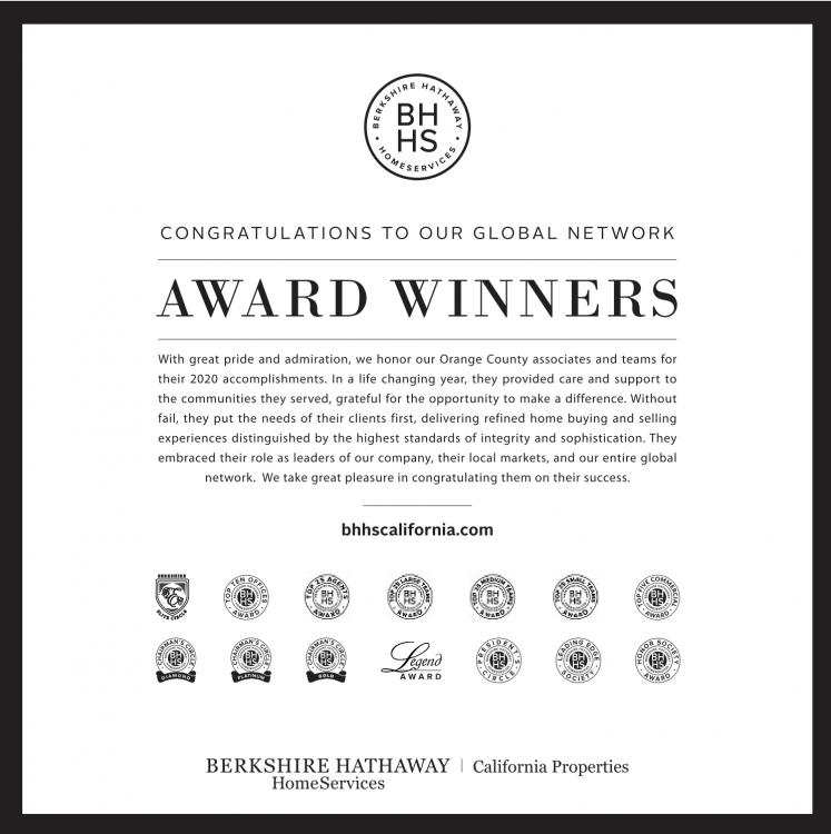 C O N G R AT U L AT I O N S TO O U R G LO B A L N E T W O R K AWARD WINNERS With great pride and admiration, we honor our Orange County associates and teams for their 2020 accomplishments. In a life changing year, they provided care and support to the communities they served, grateful for the opportunity to make a difference. Without fail, they put the needs of their clients first, delivering refined home buying and selling experiences distinguished by the highest standards of integrity and sophistication. They embraced their role as leaders of our company, their local markets, and our entire global network. We take great pleasure in congratulating them on their success. bhhscalifornia.com