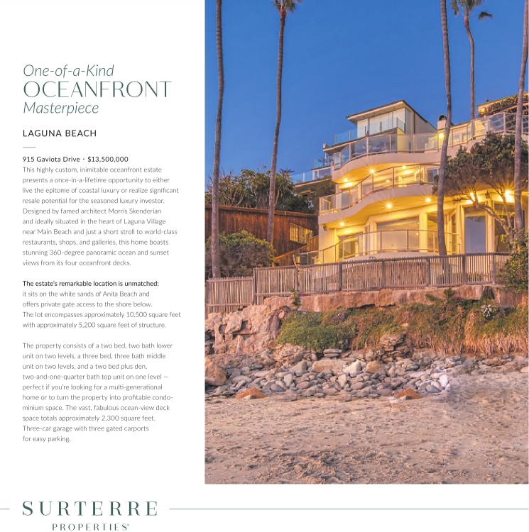 Designed by famed architect Morris Skenderian and ideally situated in the heart of Laguna Village near Main Beach and just a short stroll to world-class restaurants, shops, and galleries, this home boasts stunning 360-degree panoramic ocean and sunset views from its four oceanfront decks.