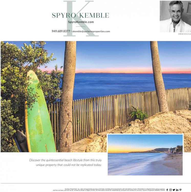 SPYRO KEMBLE SpyroKemble.com 949.689.8377 · skemble@surterreproperties.com Discover the quintessential beach lifestyle from this truly unique property that could not be replicated today. DRE#01012126 Surterre Properties ® ,Inc. does not guarantee accuracy of all data, including all measurements and calculations of area. Information is obtained from various sources and has not been, and will not be, verified by Broker or Agent ofMLS.All information should be independently reviewed and verified foraccuracy. Surterre Properties DRE#01778230
