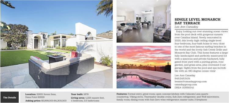 The Details Location: 32631 Seven Seas, Dana Point 92629 Asking price: $3,999,000-$4,300,000 Year built: 1979 Living area: 4,225 square feet, 4 bedroom, 3.5 bathrooms SINGLE LEVEL MONARCH DAY TERRACE Lee Ann Canaday Enjoy looking out over stunning ocean views from the pool deck with gorgeous sunsets over Catalina Island. Newly renovated in 2020, this lovely high ceiling single-level four-bedroom, four-bath home is very close to one of the most famous surfing beaches in the world and the lovely Salt Creek Grille and Monarch Bay Club. This home features a large fully landscaped and perfectly manicured lot with a spacious and private backyard, fully gated front yard with a putting green, rose garden, and grass area, plus oversized 3-car garage. Sights from the pool and spa incredible with an 180-degree ocean vista! Lee Ann Canaday 949.249.2424 leeann@canadaygroup.com canadaygroup.com DRE#: 00560041 Features: Formal entry; great room; open concept kitchen with Calacata Laza quartz countertop, Viking stove, Thermador double ovens, Sub-Zero refrigerator, and Wolf microwave; family room; dining room with Sub-Zero wine refrigerator; master suite; 3 fireplaces See also