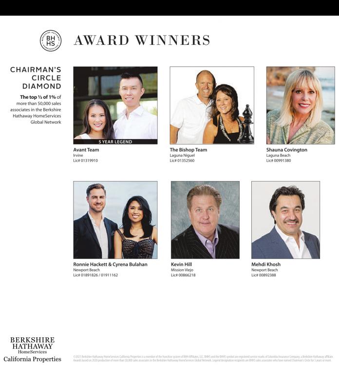 CHAIRMAN’S CIRCLE DIAMOND Thetop ½of1%of morethan50,000 sales associatesinthe Berkshire Hathaway HomeServices Global Network AWARD WINNERS AvantTeam Irvine Lic# 01319910 5YEAR LEGEND TheBishop Team Laguna Niguel Lic# 01352560 Shauna Covington Laguna Beach Lic#00991380 Ronnie Hackett &Cyrena Bulahan NewportBeach Lic# 01891826 /01911162 Kevin Hill Mission Viejo Lic# 00866218 Mehdi Khosh NewportBeach Lic# 00892388 ©2021 BerkshireHathawayHomeServices California Properties is amember of the franchise system of BHH Affiliates, LLC. BHHS and the BHHS symbol areregistered servicemarks of Columbia InsuranceCompany, aBerkshireHathaway affiliate. Awards based on 2020 production of morethan50,000sales associatesinthe BerkshireHathaway HomeServices Global Network.Legend designation recipients areBHHS sales associateswho have earned Chairman's Circle for 5years or more.