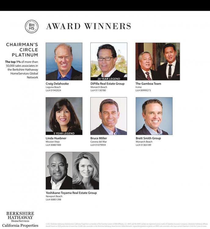 CHAIRMAN’S CIRCLE PLATINUM Thetop 1% of morethan 50,000 sales associatesin the BerkshireHathaway HomeServices Global Network AWARD WINNERS Craig Delahooke Laguna Beach Lic#01942024 20 YEAR LEGEND DiPilla Real Estate Group Monarch Beach Lic# 01130780 TheGamboa Team Irvine Lic# 00999273 Linda Huebner Mission Viejo Lic# 00887400 5YEAR LEGEND BruceMiller Corona del Mar Lic# 01079959 Brett Smith Group Monarch Beach Lic# 01365189 Yoshikane-Toyama Real Estate Group NewportBeach Lic# 00801398 ©2021 BerkshireHathawayHomeServices California Properties is amember of the franchise system of BHH Affiliates, LLC. BHHS and the BHHS symbol areregistered servicemarks of Columbia InsuranceCompany, aBerkshireHathaway affiliate. Awards based on 2020 production of morethan50,000sales associatesinthe BerkshireHathaway HomeServices Global Network.Legend designation recipients areBHHS sales associateswho have earned Chairman's Circle for 5years or more.
