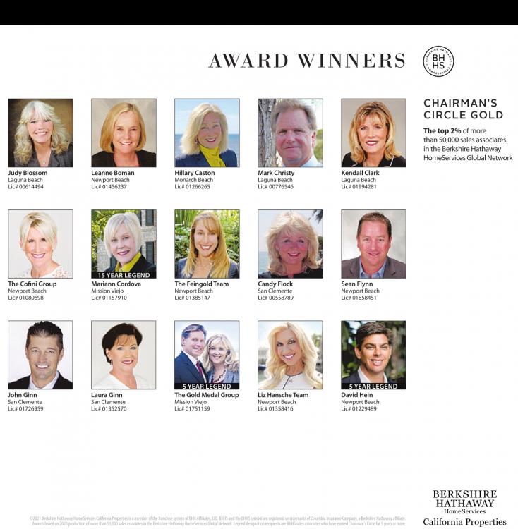 Awards based on 2020 production of morethan50,000sales associatesinthe BerkshireHathaway HomeServices Global Network.Legend designation recipients areBHHS sales associateswho have earned Chairman's Circle for 5years or more.