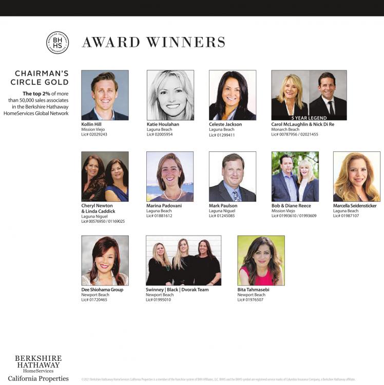 CHAIRMAN’S CIRCLE GOLD The top 2% of more than 50,000 sales associates in the BerkshireHathaway HomeServices Global Network AWARD WINNERS Kollin Hill Mission Viejo Lic# 02029243 Katie Houlahan Laguna Beach Lic# 02005954 CelesteJackson Laguna Beach Lic# 01299411 5YEAR LEGEND CarolMcLaughlin &NickDiRe Monarch Beach Lic# 00787956 /02021455 Cheryl Newton &Linda Caddick Laguna Niguel Lic# 00576950 /01169025 Marina Padovani Laguna Beach Lic# 01881612 Mark Paulson Laguna Niguel Lic# 01245085 Bob&Diane Reece Mission Viejo Lic# 01993610 /01993609 Marcella Seidensticker Laguna Beach Lic#01987107 Dee Shiohama Group NewportBeach Lic# 01720465 Swinney |Black |DvorakTeam NewportBeach Lic# 01995010 Bita Tahmasebi NewportBeach Lic# 01976507 ©2021 BerkshireHathawayHomeServices California Properties is amember of the franchise system of BHH Affiliates, LLC. BHHS and the BHHS symbol areregistered servicemarks of Columbia InsuranceCompany, aBerkshireHathaway affiliate.
