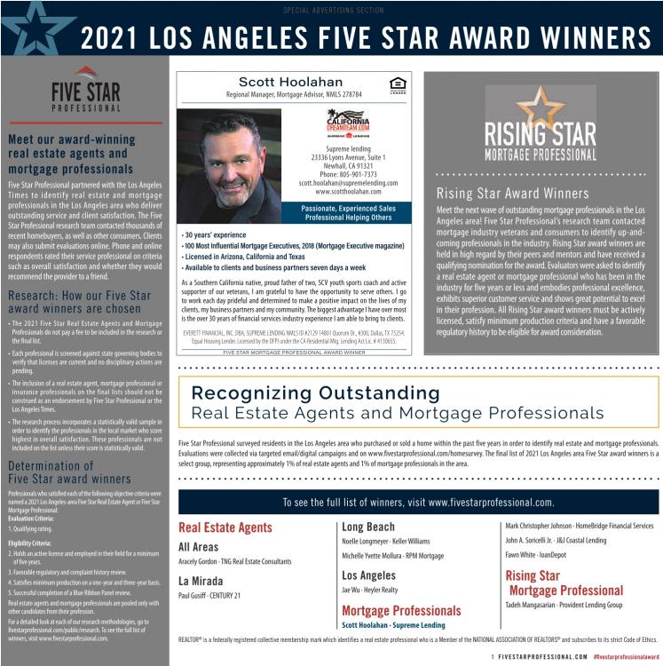 Five Star Professional partnered with the LosAngeles Times to identify real estate and mortgage professionals in the Los Angeles area who deliver outstanding service and client satisfaction. The Five Star Professional research team contactedthousands of recent homebuyers,aswell as other consumers.Clients mayalso submit evaluations online.Phone and online respondents ratedtheir serviceprofessional on criteria such as overall satisfaction and whether they would recommend the provider to afriend.