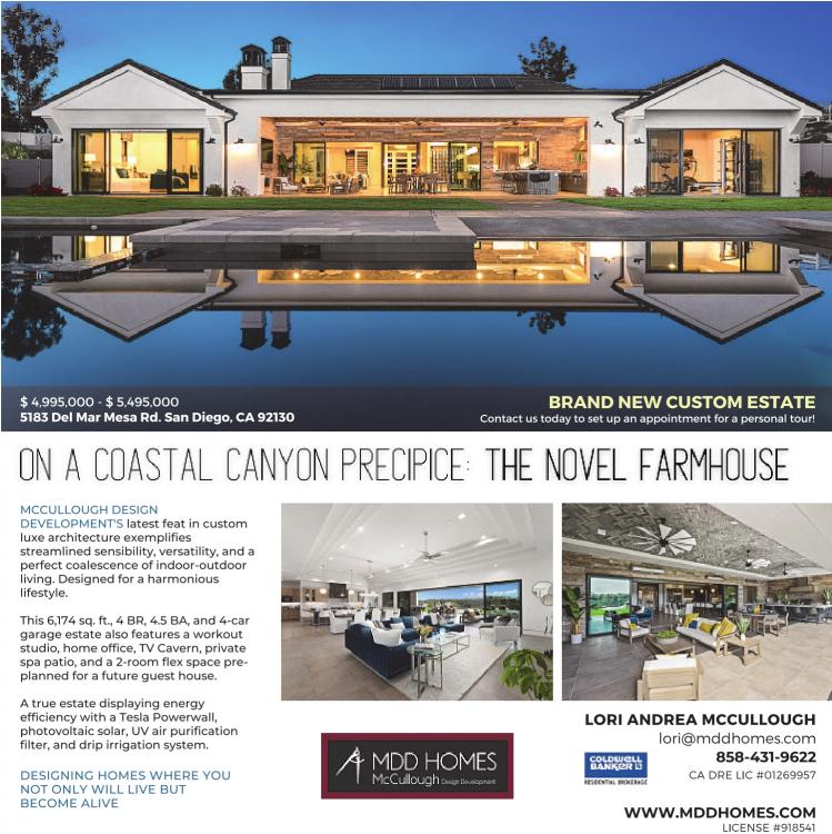 $ 4,995,000 - $ 5,495,000 BRAND NEW CUSTOM ESTATE 5183 Del Mar Mesa Rd. San Diego, CA 92130 Contact us today to set up an appointment for a personal tour! MCCULLOUGH DESIGN DEVELOPMENT'S latest feat in custom luxe architecture exemplifies streamlined sensibility, versatility, and a perfect coalescence of indoor-outdoor living. Designed for a harmonious lifestyle. This 6,174 sq. ft., 4 BR, 4.5 BA, and 4-car garage estate also features a workout studio, home office, TV Cavern, private spa patio, and a 2-room flex space preplanned for a future guest house. A true estate displaying energy efficiency with a Tesla Powerwall, photovoltaic solar, UV air purification filter, and drip irrigation system. DESIGNING HOMES WHERE YOU NOT ONLY WILL LIVE BUT BECOME ALIVE LORI ANDREA MCCULLOUGH lori@mddhomes.com 858-431-9622 CA DRE LIC #01269957 WWW.MDDHOMES.COM LICENSE #918541