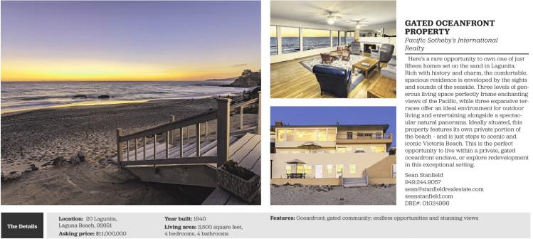 The Details Location: 20 Lagunita, Laguna Beach, 92651 Asking price: $11,000,000 Year built: 1940 Living area: 3,500 square feet, 4 bedrooms, 4 bathrooms GATED OCEANFRONT PROPERTY Pacific Sotheby’s International Realty Here’s a rare opportunity to own one of just fifteen homes set on the sand in Lagunita. Rich with history and charm, the comfortable, spacious residence is enveloped by the sights and sounds of the seaside. Three levels of generous living space perfectly frame enchanting views of the Pacific, while three expansive terraces offer an ideal environment for outdoor living and entertaining alongside a spectacular natural panorama. Ideally situated, this property features its own private portion of the beach – and is just steps to scenic and iconic Victoria Beach. This is the perfect opportunity to live within a private, gated oceanfront enclave, or explore redevelopment in this exceptional setting. Sean Stanfield 949.244.9057 sean@stanfieldrealestate.com seanstanfield.com DRE#: 01024996 Features: Oceanfront; gated community; endless opportunities and stunning views See also