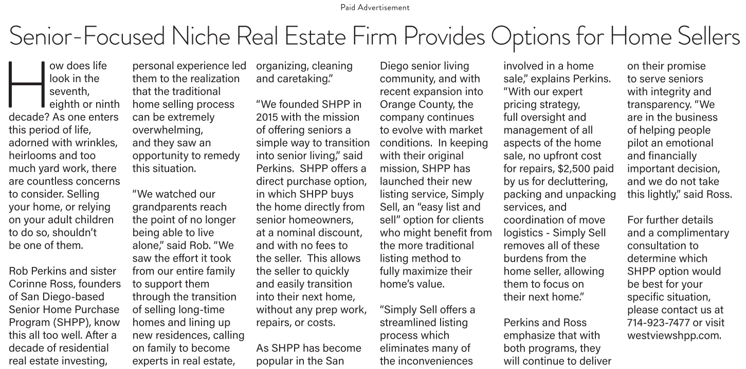 Diego senior living community, and with recent expansion into Orange County, the company continues to evolve with market conditions. In keeping with their original mission, SHPP has launched their new listing service, Simply Sell, an “easy list and sell” option for clients who might benefit from the more traditional listing method to fully maximize their home’s value.