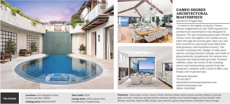 The Details Location: 4541 Brighton Road, Corona del Mar 92625 Asking price: $35,000,000 Year built: 2018 Living area: 7,000 square feet, 5 bedrooms, 6 bathrooms CAMEO SHORES ARCHITECTURAL MASTERPIECE Surterre Properties Located in the highly exclusive Cameo Shores neighborhood, this 7,000-square-foot architectural masterpiece was designed to impress. The jaw-dropping panoramic Pacific Ocean views throughout are evident as you enter through the private gate. Here you will find yourself in a personal oasis filled with lush greenery and beautiful scenery. The coastal-contemporary design of wide-open spaces, soaring beamed ceilings, and walls of glass perfectly complement the natural environment and immaculate grounds. Perched cliffside, enjoy the sound of the crashing waves and mesmerizing sunsets from the backyard, complete with a built-in BBQ, cozy firepit, and in-ground spa. Adrienne Brandes 714.401.8277 abrandes@surterreproperties.com adriennebrandes.com DRE#: 01337636 Features: Panoramic ocean views; Cameo Shores estate; direct beach access; behind a private gate; security cameras; double kitchen islands; infinity pool; heated loggia; private theater with kitchen and bar; built-in BBQ, firepit, spa; elevator; gym; temperature-controlled wine storage See also