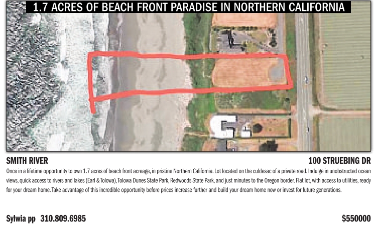 1.7 ACRES OF BEACH FRONT PARADISE IN NORTHERN CALIFORNIA SMITH RIVER 100STRUEBING DR Once in alifetime opportunitytoown 1.7 acres of beach front acreage,inpristine Northern California.Lot located on theculdesac of aprivate road.Indulge in unobstructed ocean views,quick access to rivers andlakes (Earl &Tolowa),Tolowa Dunes State Park,Redwoods State Park,andjustminutestothe Oregonborder.Flatlot,with access to utilities,ready foryourdream home.Take advantage of this incredible opportunity before prices increase further andbuild your dream home noworinvest for future generations. Sylwia pp 310.809.6985 $550000