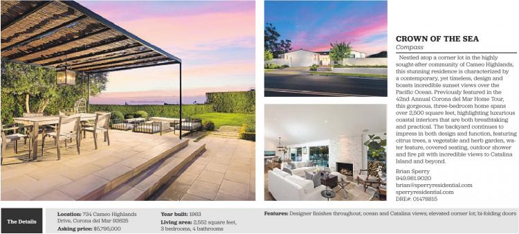 The Details Location: 734 Cameo Highlands Drive, Corona del Mar 92625 Asking price: $5,795,000 Year built: 1963 Living area: 2,552 square feet, 3 bedrooms, 4 bathrooms CROWN OF THE SEA Compass Nestled atop a corner lot in the highly sought-after community of Cameo Highlands, this stunning residence is characterized by a contemporary, yet timeless, design and boasts incredible sunset views over the Pacific Ocean. Previously featured in the 42nd Annual Corona del Mar Home Tour, this gorgeous, three-bedroom home spans over 2,500 square feet, highlighting luxurious coastal interiors that are both breathtaking and practical. The backyard continues to impress in both design and function, featuring citrus trees, a vegetable and herb garden, water feature, covered seating, outdoor shower and fire pit with incredible views to Catalina Island and beyond. Brian Sperry 949.981.9020 brian@sperryresidential.com sperryresidential.com DRE#: 01478815 Features: Designer finishes throughout; ocean and Catalina views; elevated corner lot; bi-folding doors See also