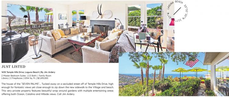 JUST LISTED 1435 Temple Hills Drive, Laguna Beach | By Jim Ardery 2Master Bedroom Suites |2.5 Bath | Family Room Library |2Firepllaces |2254 Sq. Ft. |$2,695,000 The house of the “SEVEN PALMS”... Tucked away on a secluded street off of Temple Hills Drive, high enough for fantastic views yet close enough to zip down the new sidewalk to the Village and beach. This very private property features beautiful wrap around gardens with multiple entertaining areas offering both Ocean, Catalina and Hillside views. Call Jim Ardery.