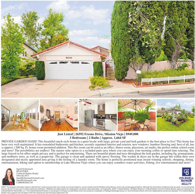 Just Listed | 26592 Fresno Drive, Mission Viejo | $949,000 3 Bedrooms | 2 Baths | Approx. 1,664 SF PRIVATE GARDEN OASIS! This beautiful ranch-style home in a quiet locale with large, private yard and lush gardens is the best place to live! This home has been very well-maintained. It has remodeled bathrooms and kitchen, recently repainted interior and exterior, new windows, bamboo flooring and, best of all, has a (approx.) 200 Sq. Ft. bonus room permitted addition. This flex room can be used as an office, fitness room, playroom, art studio, the perfect online school room and more! The possibilities are endless! The master suite opens to a secluded patio area where you can enjoy your morning coffee or spend time relaxing. The large fenced-in lot offers ample privacy and is perfect for entertaining. There are beautiful plants and trees throughout the lush garden, including fig, pomegranate, and mulberry trees, as well as a grapevine. The garage is clean and updated with epoxy flooring. The washer & dryer are in the garage but within their own designated and nicely appointed area giving it the feeling of a laundry room. The home is perfectly positioned near award winning schools, shopping, dining, entertainment, hiking and option to membership at Lake Mission Viejo where you can enjoy countless water activities, fishing, live entertainment and more! Ingrid Echternach REALTOR® Coldwell Banker Realty 949.636.4973 IngridEchternach@gmail.com IngridEchternach.com CalRE#02002320 ©2021 The property information herein is derived from various sources that may include, but not be limited to, county records and the Multiple Listing Service, and it may include approximations. Although the information is believed to be accurate, it is not warranted and you should not rely upon it without personal verification. Affiliated real estate agents are independent contractor sales associates, not employees. ©2021 Coldwell Banker. All Rights Reserved. Coldwell Banker and the Coldwell Banker logos are trademarks of Coldwell Banker Real Estate LLC. The Coldwell Banker® System is comprised of company owned offices which areowned by asubsidiary of Realogy Brokerage Group LLC and franchised offices which areindependently owned and operated. The Coldwell Banker System fully supports the principles of the Fair Housing Act and the Equal Opportunity Act.