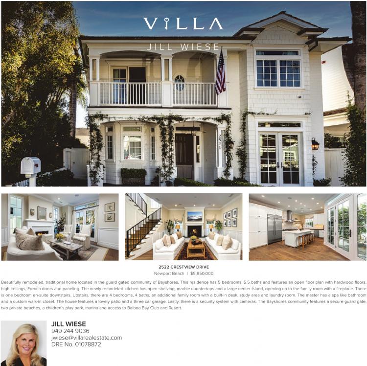 J I L L W I E S E 2522 CRESTVIEW DRIVE Newport Beach | $5,850,000 Beautifully remodeled, traditional home located in the guard gated community of Bayshores. This residence has 5 bedrooms, 5.5 baths and features an open floor plan with hardwood floors, high ceilings, French doors and paneling. The newly remodeled kitchen has open shelving, marble countertops and a large center island, opening up to the family room with a fireplace. There is one bedroom en-suite downstairs. Upstairs, there are 4 bedrooms, 4 baths, an additional family room with a built-in desk, study area and laundry room. The master has a spa like bathroom and a custom walk-in closet. The house features a lovely patio and a three car garage. Lastly, there is a security system with cameras. The Bayshores community features a secure guard gate, two private beaches, a children’s play park, marina and access to Balboa Bay Club and Resort. JILL WIESE 949 244 9036 jwiese@villarealestate.com DRE No. 01078872