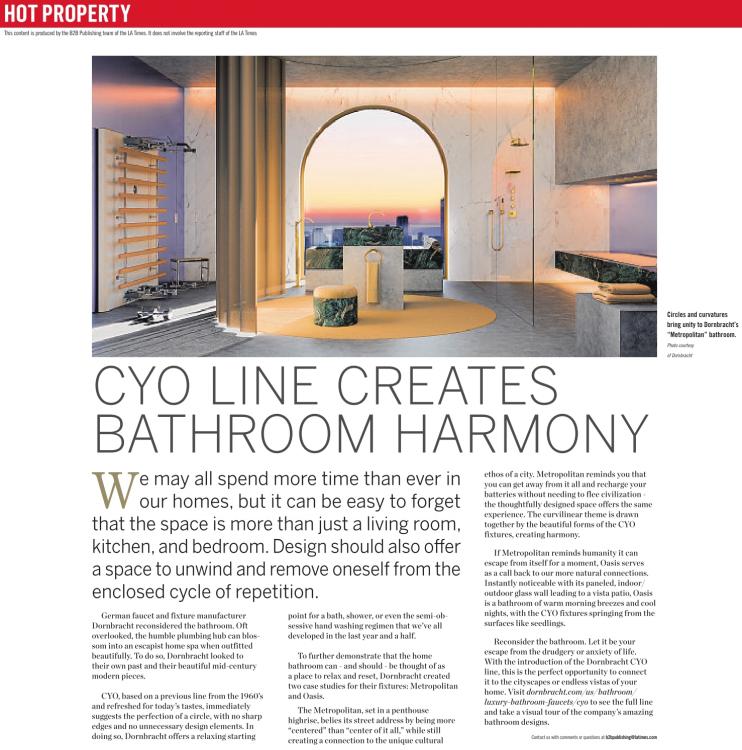 Reconsider the bathroom. Letitbeyour escape from thedrudgeryoranxiety of life. With the introduction of the Dornbracht CYO line, this is the perfect opportunity to connect it to the cityscapes or endless vistas of your home. Visit dornbracht.com/us/bathroom/ luxury-bathroom-faucets/cyo to seethe full line and takeavisual tour of the company’samazing bathroom designs.