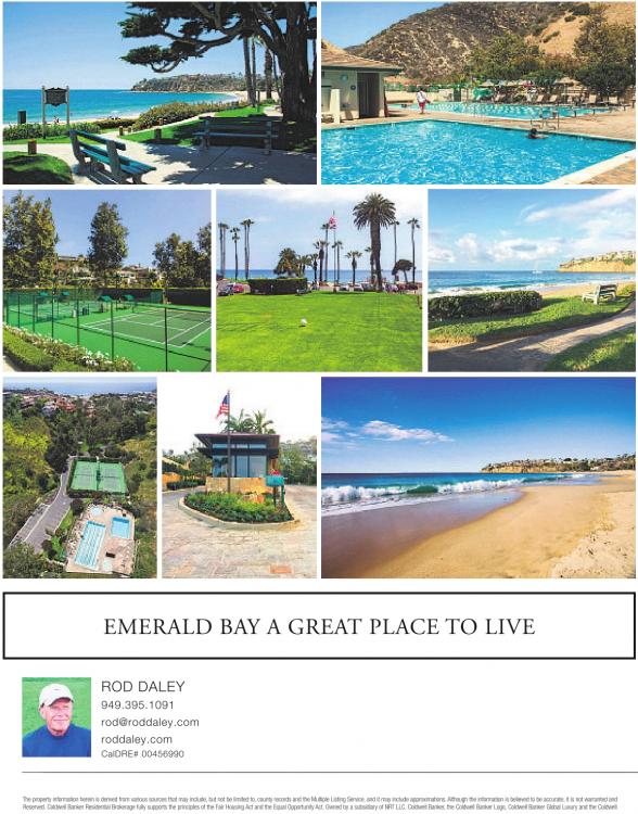 EMERALD BAY A GREAT PLACE TO LIVE ROD DALEY 949.395.1091 rod@roddaley.com roddaley.com CalDRE# 00456990 The property information herein is derivedfrom varioussources that may include, but not be limited to, countyrecords and the Multiple ListingService, and it may includeapproximations.Although the informationisbelievedtobeaccurate,itisnot warranted and Reserved. ColdwellBanker Residential Brokerage fully supports the principles of theFair Housing Act and the EqualOpportunity Act. Owned by asubsidiary of NRTLLC. Coldwell Banker,the ColdwellBanker Logo, Coldwell Banker Global Luxuryand the Coldwell