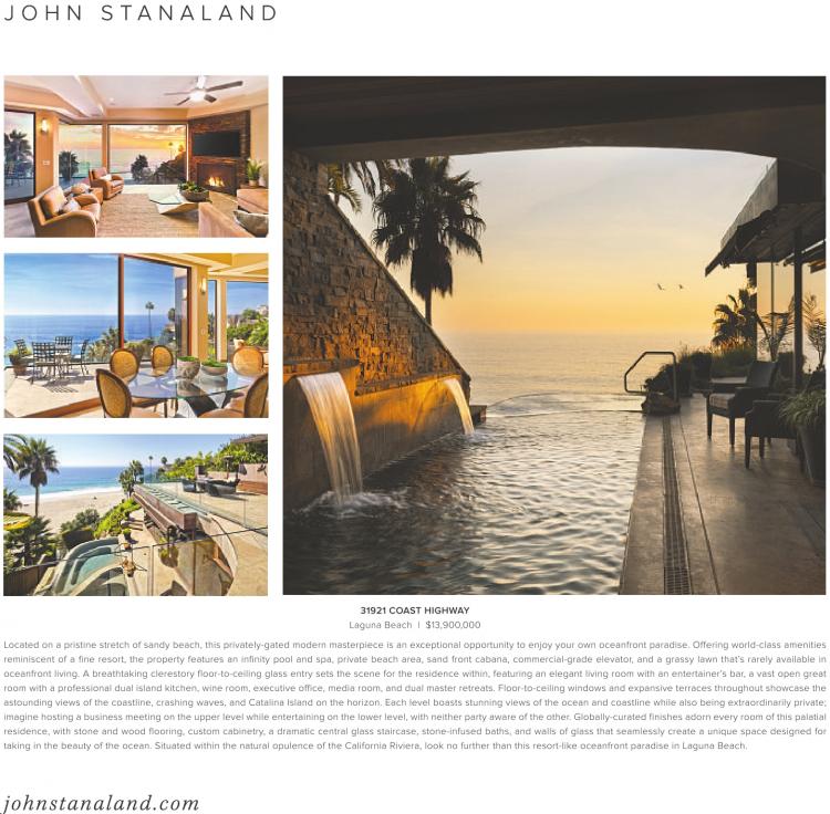 J O H N S T A N A L A N D 31921 COAST HIGHWAY Laguna Beach | $13,900,000 Located on a pristine stretch of sandy beach, this privately-gated modern masterpiece is an exceptional opportunity to enjoy your own oceanfront paradise. Offering world-class amenities reminiscent of a fine resort, the property features an infinity pool and spa, private beach area, sand front cabana, commercial-grade elevator, and a grassy lawn that’s rarely available in oceanfront living. A breathtaking clerestory floor-to-ceiling glass entry sets the scene for the residence within, featuring an elegant living room with an entertainer’s bar, a vast open great room with a professional dual island kitchen, wine room, executive office, media room, and dual master retreats. Floor-to-ceiling windows and expansive terraces throughout showcase the astounding views of the coastline, crashing waves, and Catalina Island on the horizon. Each level boasts stunning views of the ocean and coastline while also being extraordinarily private; imagine hosting a business meeting on the upper level while entertaining on the lower level, with neither party aware of the other. Globally-curated finishes adorn every room of this palatial residence, with stone and wood flooring, custom cabinetry, a dramatic central glass staircase, stone-infused baths, and walls of glass that seamlessly create a unique space designed for taking in the beauty of the ocean. Situated within the natural opulence of the California Riviera, look no further than this resort-like oceanfront paradise in Laguna Beach. johnstanaland .com
