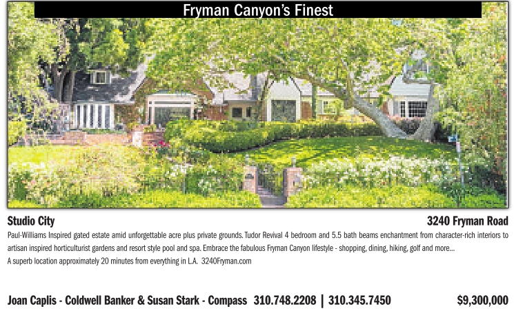 Paul-WilliamsInspired gated estate amid unforgettableacreplusprivate grounds.Tudor Revival 4bedroomand 5.5bathbeams enchantmentfromcharacter-rich interiors to artisan inspiredhorticulturistgardens andresortstyle pool and spa. Embrace thefabulous Fryman Canyon lifestyle -shopping,dining, hiking,golfand more... Asuperb location approximately 20 minutes from everything in L.A. 3240Fryman.com