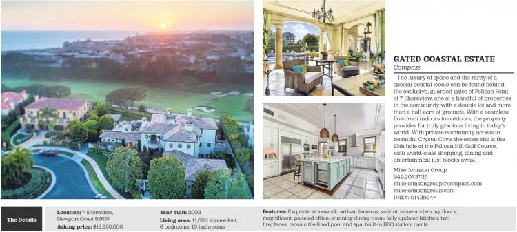 The Details Location: 7 Shoreview, Newport Coast 92657 Asking price: $12,950,000 Year built: 2003 Living area: 11,000 square feet, 6 bedrooms, 10 bathrooms GATED COASTAL ESTATE Compass The luxury of space and the rarity of a special coastal locale can be found behind the exclusive, guarded gates of Pelican Point at 7 Shoreview, one of a handful of properties in the community with a double lot and more than a half-acre of grounds. With a seamless flow from indoors to outdoors, the property provides for truly gracious living in today’s world. With private community access to beautiful Crystal Cove, the estate sits at the 13th hole of the Pelican Hill Golf Course, with world-class shopping, dining and entertainment just blocks away. Mike Johnson Group 949.207.3735 mikejohnsongroup@compass.com mikejohnsongroup.com DRE#: 01429647 Features: Exquisite stonework; artisan lanterns; walnut, stone and ebony floors; magnificent, paneled office; stunning dining room; fully updated kitchen; two fireplaces; mosaic tile-lined pool and spa; built-in BBQ station; casita See also